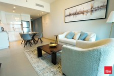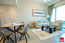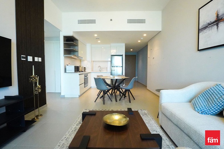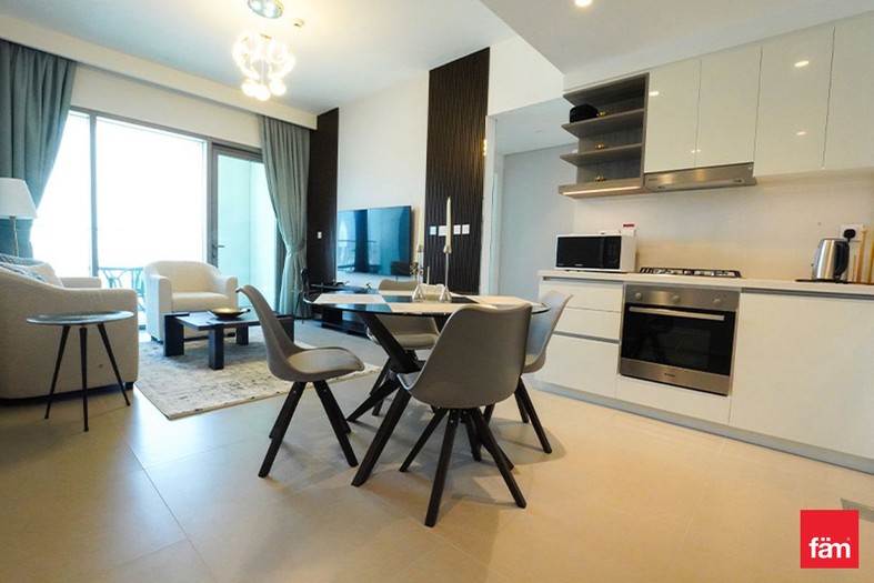The apartment features an open-plan living and dining area, a modern kitchen, and large windows capturing open DIFC and city skyline views.